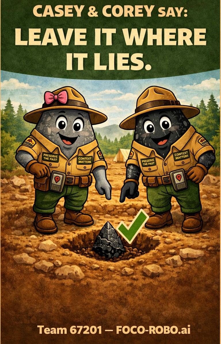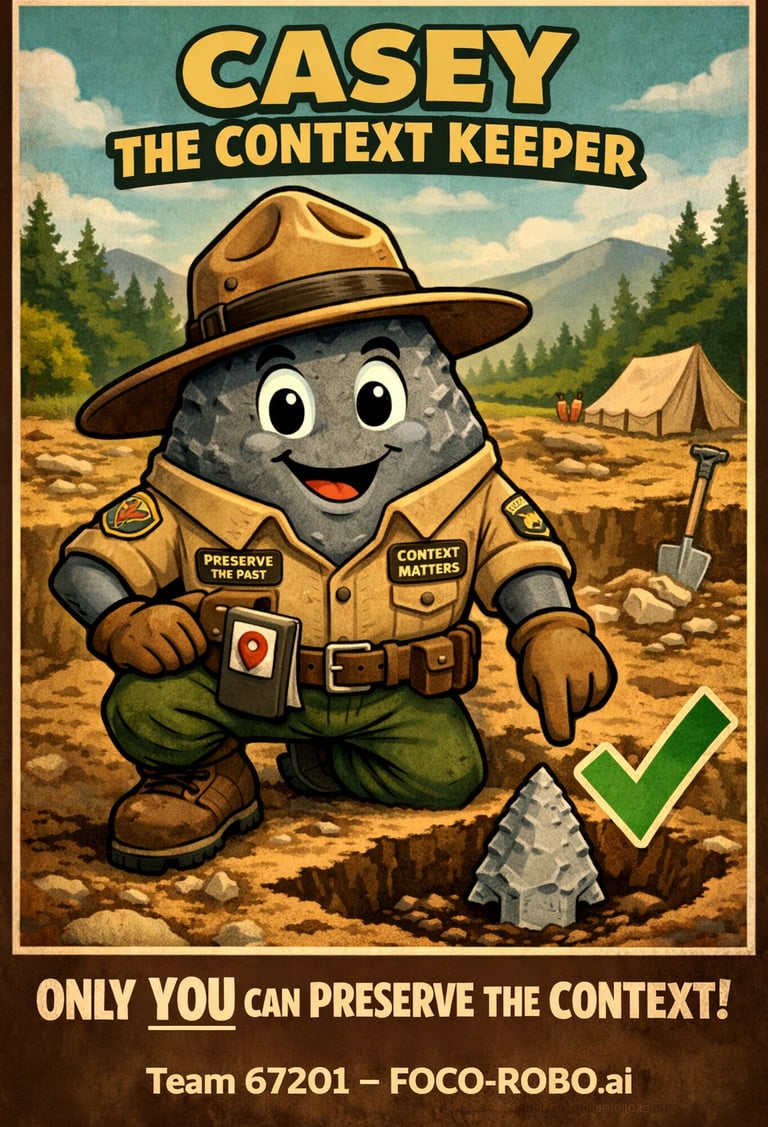 We shared our innovation with archaeologists at International Archaeology Day, collected their feedback with a survey, and presented our learnings to ~100 people at the FLL Explore Expo and ~50 people at Pikes Peak FRC Regional. We also created mascots like “Casey The Context Keeper” to help educate the public about archaeology.